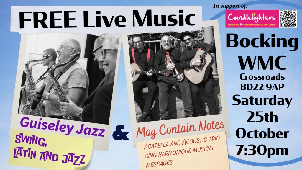 Following last winter’s successful joint gig in Howarth, we’re teaming up with May Contain Notes again, for a musical evening at Bocking WMC in Crossroads on Sat. October the 25th at 7:30pm. There’s no entry fee, so all you have to do is turn up and enjoy the tunes!